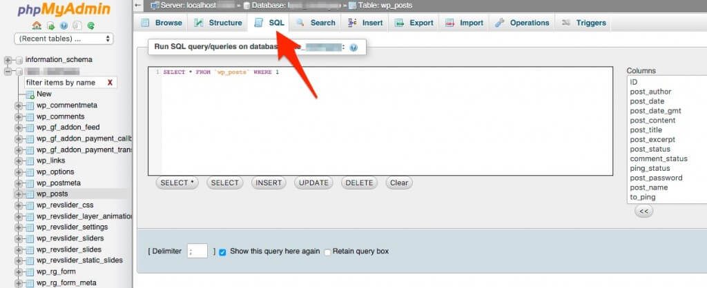 4. Lalu masukkan kode berikut. Jika sudah selesai, klik Go DELETE FROM wp_posts where post_status like ‘%test%’ *bagian wp_post silahkan diganti dengan nama asli database anda (contoh: wp3_post) *bagian post_status silahkan bisa diganti sesuai spamnya, misal spam ada di post_type:spam maka ganti ke post_type *bagian ‘%test%’ bisa diganti ‘%spam%’ sesuai dengan status atau tipe spamnya
