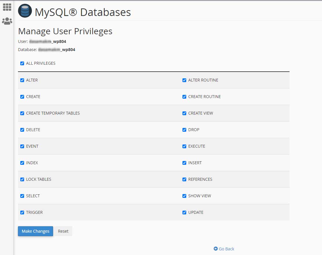Checklist ALL PREVILEGES - Selanjutnya adalah cek wp-config.php pada folder web wordpress pastikan nama, User dan Password sesuai dengan yang ada jika tidak sesuai maka akan error.